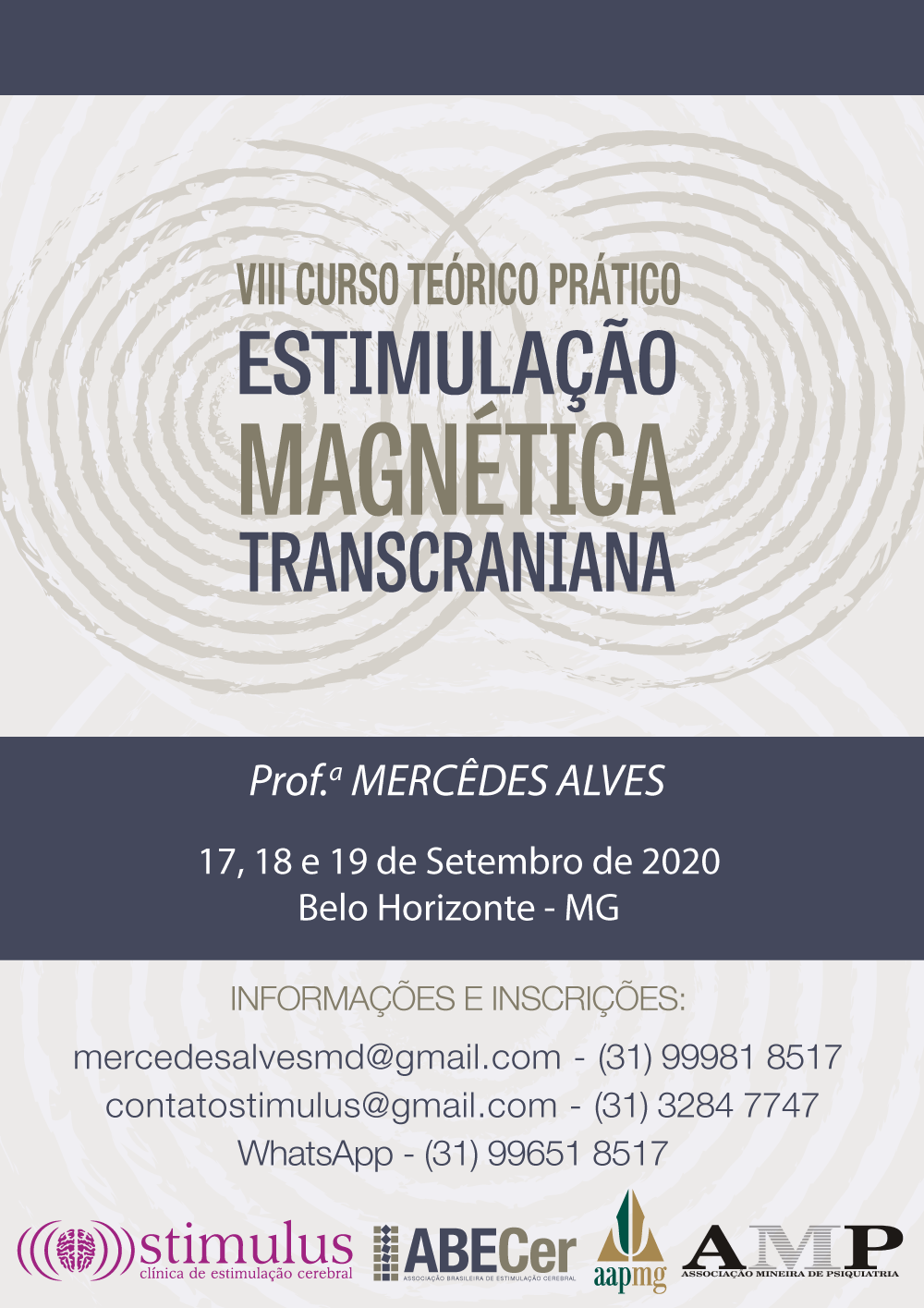 Nos dias 17, 18 e 19 de Setembro de 2020, o VIII CURSO TEÓRICO PRÁTICO DE ESTIMULAÇÃO MAGNÉTICA TRANSCRANIANA (EMT) e o V CURSO TEÓRICO PRÁTICO DE ELETROCONVULSOTERAPIA (ECT) serão ministrados em Belo Horizonte, pela Dra. Mercêdes Alves.